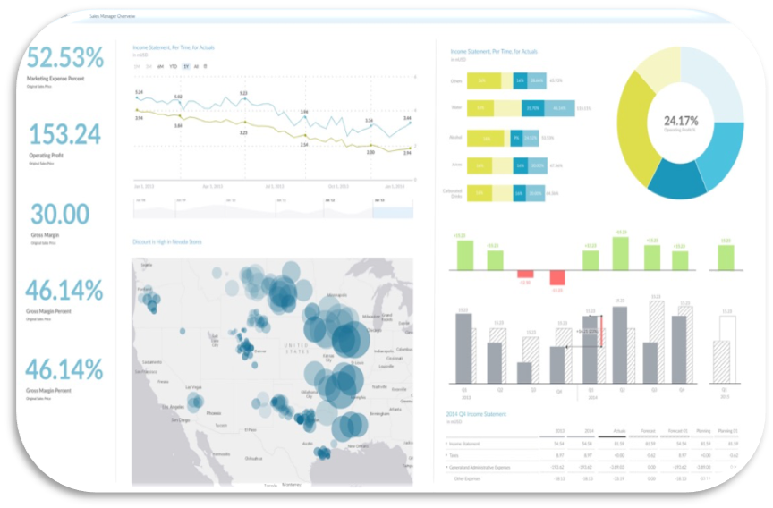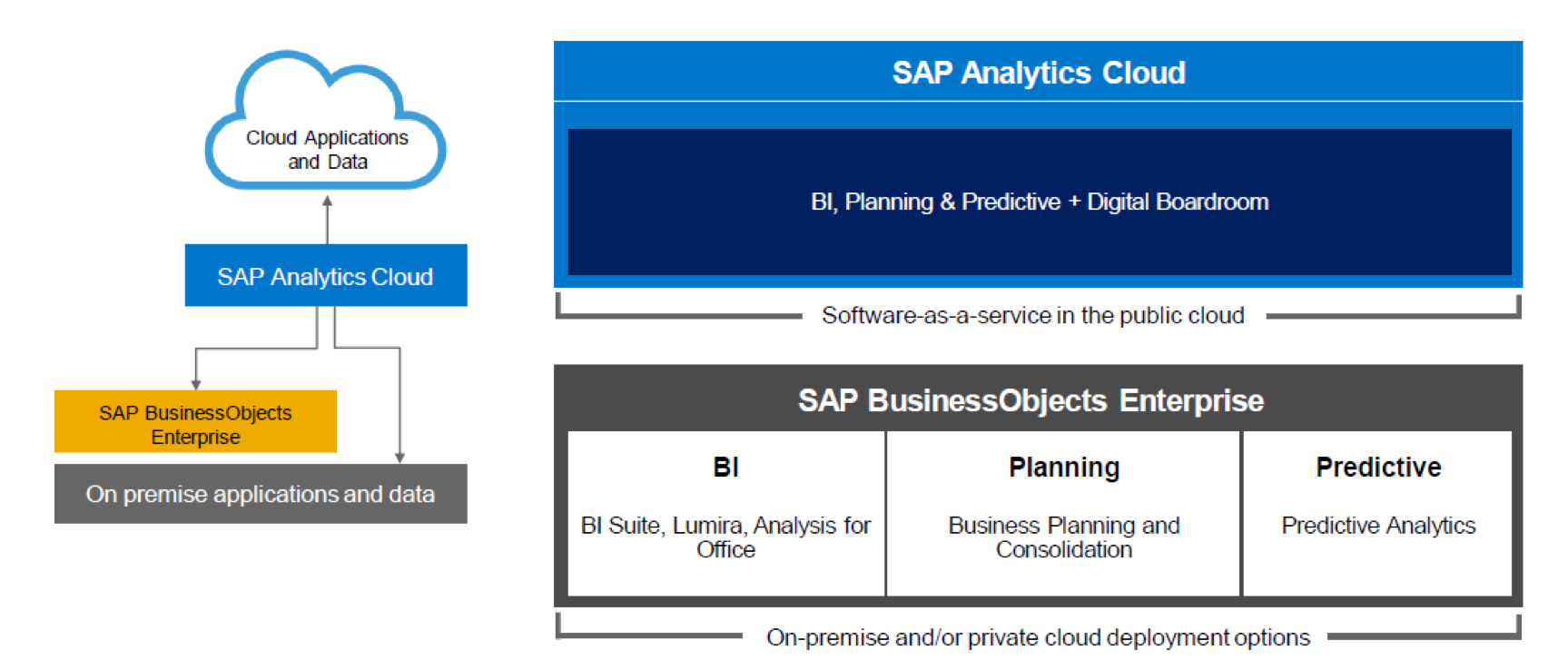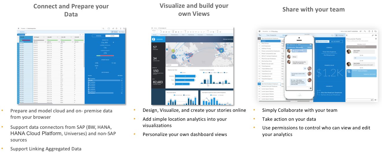 SAP Analytics Cloud simplifies financial planning and analysis and allows you to analyze data and collaborate in real time. SAP Analytics Cloud integrates with SAP Business Planning and Consolidation with data import and export capabilities. It also connects to on premise SAP S/4HANA, SAP HANA, or SAP Business Warehouse (SAP BW) systems without data replication. It can also connect to other database platform, google drive, google big query, and flat files.