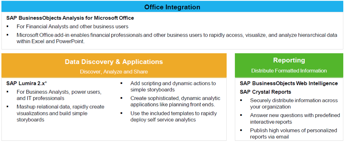 SAP Business Objects is an Enterprise Grade analytical platform that can be deployed on-premise and private cloud. It provides a wide range of reporting features such as dashboard, self-service, formatted report and report distribution via email. The product covers these capabilities: